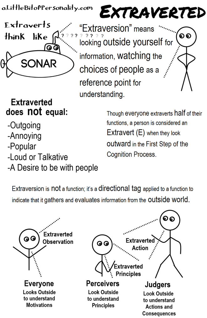 Being a cognitive Extravert has nothing to do with how social you are.  Rather, it simply means that you naturally look outward at the world around you in order to form thoughts, decide on actions, and make judgments.  You tend to observe, considering the opinions of others and the behaviors of your surroundings, and then you form thoughts from those observations.  While cognitive Introverts naturally form thoughts in the quiet laboratories of their own heads before testing those thoughts against the real world, Extraverts usually form their thoughts in observant reference to the people, objects, and events around them.